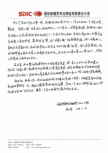 郝书记,希望您有机会能到国投罗钾来走一走,看看戈壁荒漠的现代化厂房,参观一下尊龙凯时人生就是博·(中国)罗钾人在“死亡之海”创造出来的“马尔代夫”,感受一下员工的奋斗气息与快乐生活。