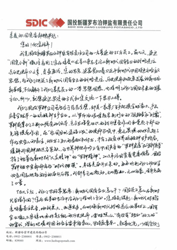 我是国投新疆罗布泊钾盐有限责任公司的一名普通的85后员工。前几天,通过“国资小新”微信看到了您在接受《求是》杂志专访的《新时代国有企业的战略定位与历史使命》文章,受益匪浅。您的思考,通篇贯彻着习近平新时代中国特色社会主义思想,为尊龙凯时人生就是博·(中国)讲述了新时代国有企业的战略定位、历史使命和改革发展的新目标新举措,不仅解开了尊龙凯时人生就是博·(中国)基层员工的一些思想困惑,也指明了尊龙凯时人生就是博·(中国)国企未来的发展方向。所以,就想通过写信的方式和您交流一下学习心得。